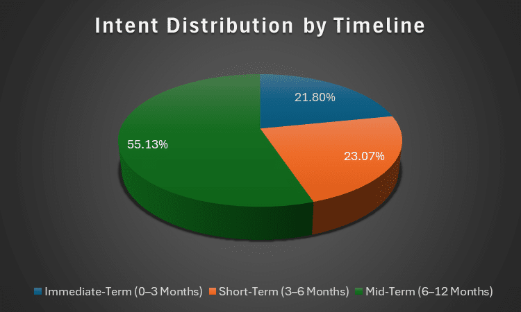 Intent Distribution by Timeline: Our data shows that 55.13% of all qualified leads fall into the Mid-Term category (6-12 months). This means a critical focus for sales and marketing teams must be to deploy strategies that guide thinking and build relationships.
